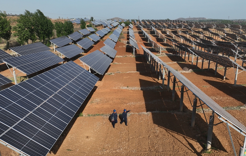 4月16日,工人在河北省石家庄市灵寿县谭庄乡程家庄村的“农光互补”光伏发电场巡查(无人机照片)